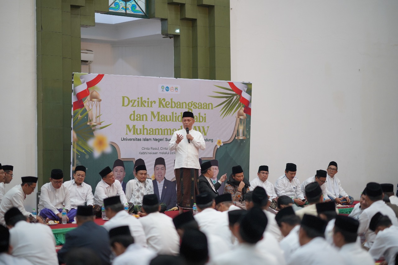 Dalam sambutannya, Rektor UIN Sunan Gunung Djati Bandung, Prof. Dr. H. Rosihon Anwar, M.Ag., menyampaikan apresiasi atas terselenggaranya kegiatan ini yang tidak hanya memperkuat kecintaan kepada Rasulullah Saw, tetapi meneguhkan komitmen kebangsaan di tengah kehidupan beragama dan berbangsa.