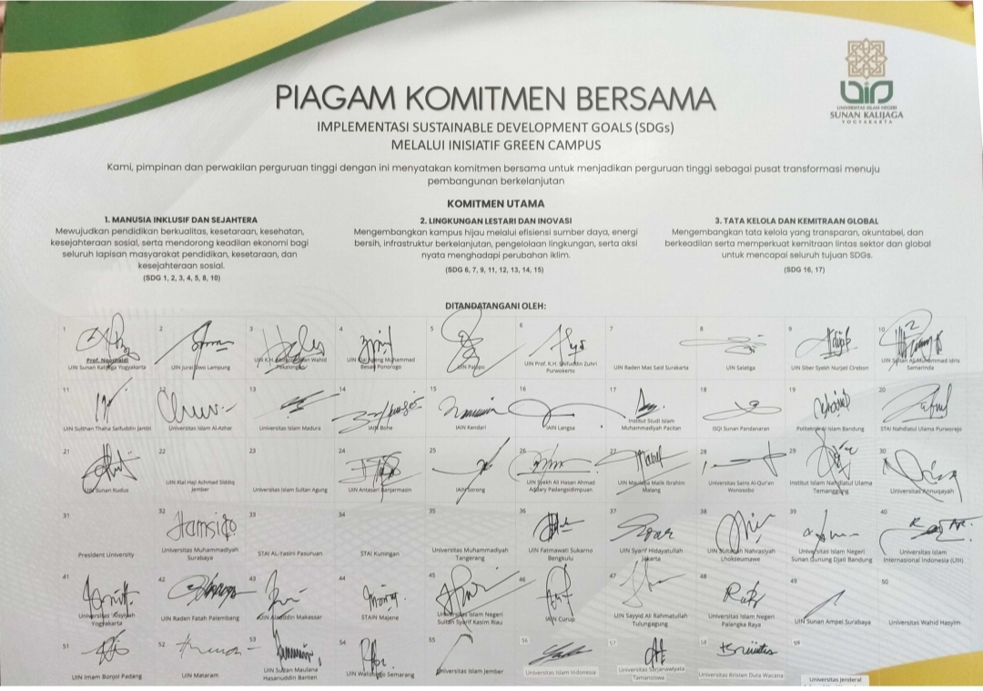 Dalam piagam komitmen tersebut, perguruan tinggi peserta sepakat mendorong tiga komitmen utama, yakni mewujudkan manusia inklusif dan sejahtera, membangun lingkungan lestari dan inovasi, serta memperkuat tata kelola dan kemitraan global. “Nilai-nilai ini selaras dengan visi UIN Bandung dalam membangun kampus unggul, hijau, dan berdaya saing global yang berbasis rahmatan lil alamin,” jelasnya