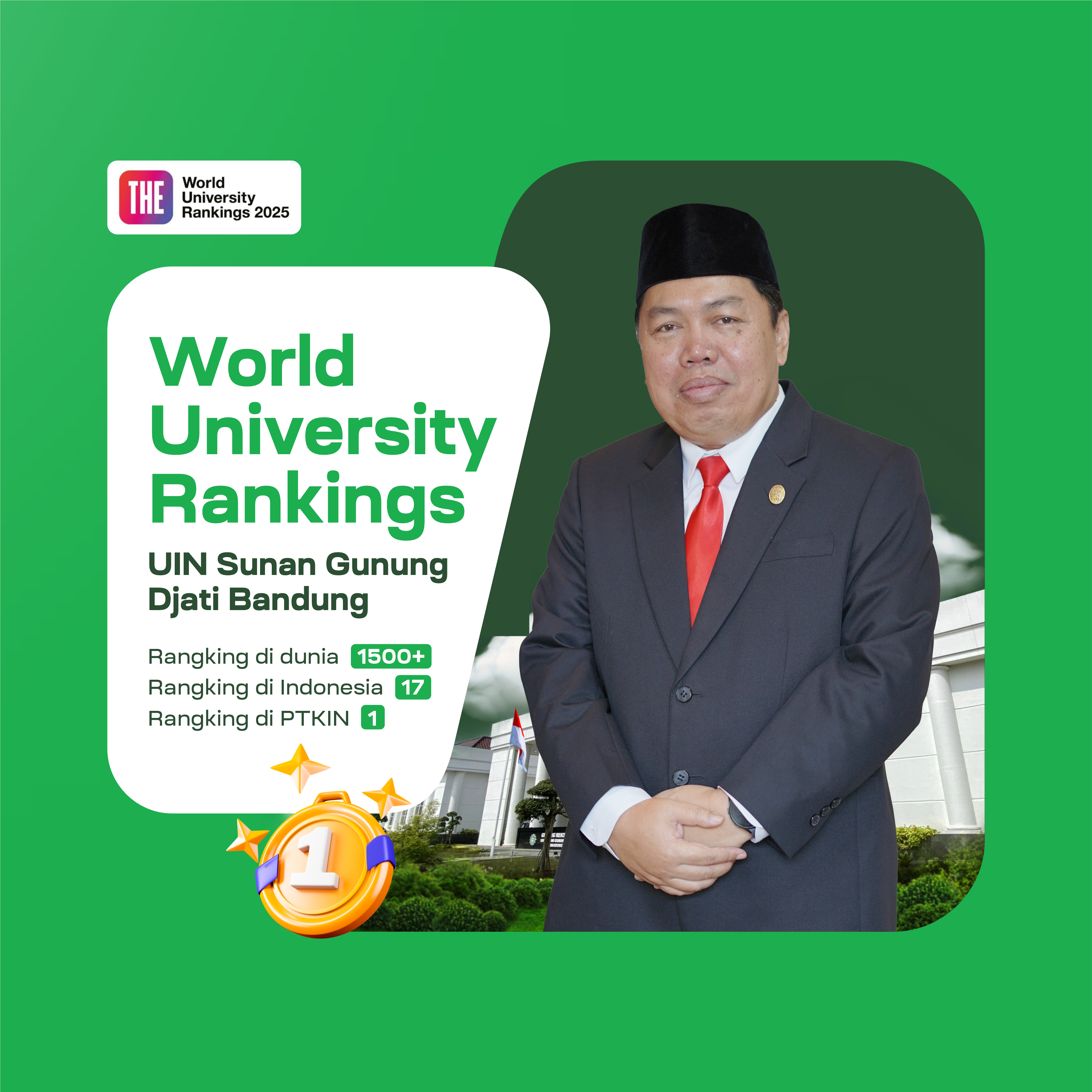 Secara nasional, UIN Bandung berada di peringkat ke-17 di Indonesia, dan secara global masuk dalam klaster 1501+ dunia. Capaian ini menjadi bukti konkret dari komitmen kampus dalam meningkatkan mutu akademik, riset, serta tata kelola pendidikan tinggi berbasis internasionalisasi.