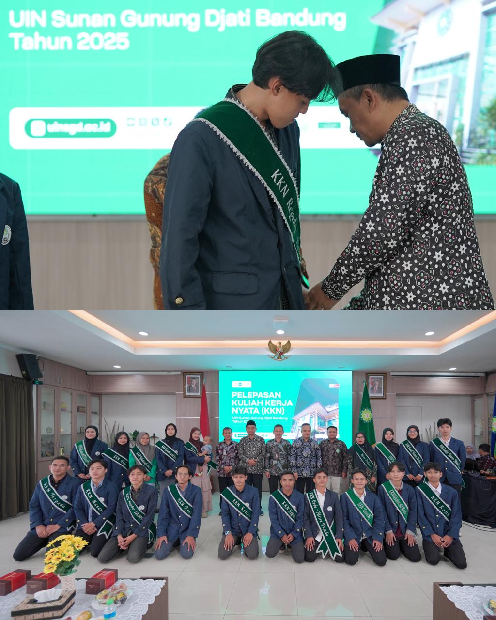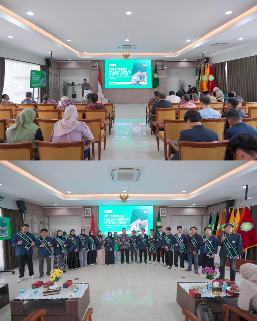 UINSGD.AC.ID (Humas) — Wakil Rektor I UIN Sunan Gunung Djati Bandung, Prof. Dr. H. Dadan Rusmana, M.Ag., didampingi Ketua Lembaga Penelitian dan Pengabdian kepada Masyarakat (LP2M), Dr. H. Setia Gumilar, S.Ag., M.Hum., secara resmi melepas peserta Kuliah Kerja Nyata (KKN) Tahun 2025. Prosesi pelepasan digelar secara hibrid, melalui Zoom Meeting dan luring di Gedung O. Djauharuddin AR, Jumat (18/7/2025).