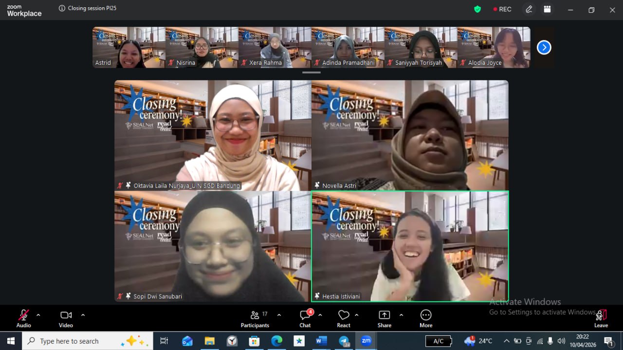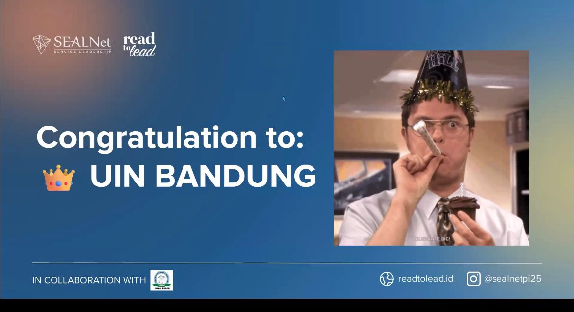 Setelah seluruh Perguruan Tinggi melakukan persentasi mengenai proyek literasinya masing-masing, tim dari SEALNet dan FPPTI Jatim mengumumkan bahwa Perpustakaan UIN Sunan Gunung Djati Bandung menjadi First Winner Best Group program SEALNet (South East Asian Leadership Network) Project Indonesia 2025 “Read to Lead”.