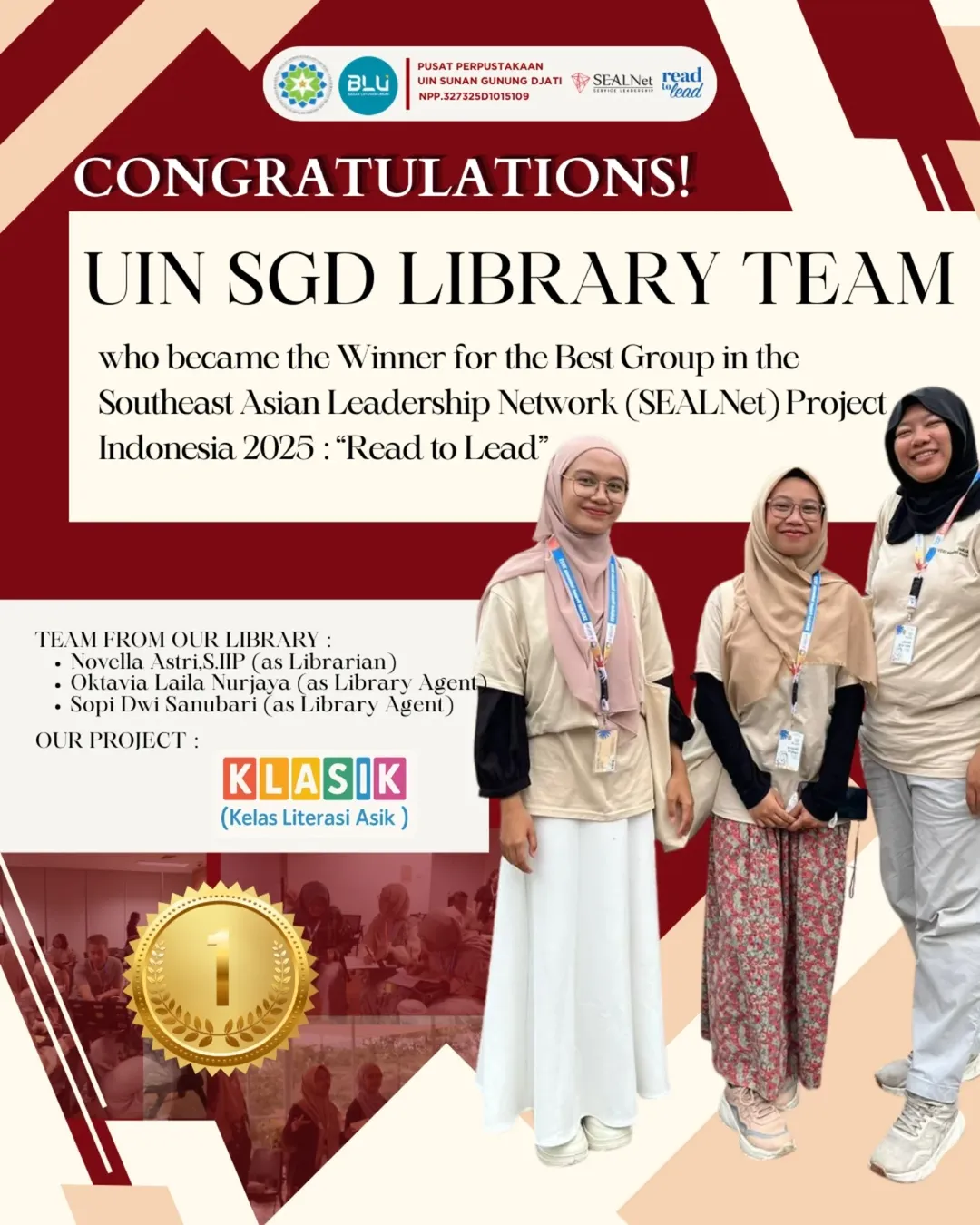 UINSGD.AC.ID (Humas) — Tim Perpustakaan UIN Sunan Gunung Djati berhasil meraih penghargaan Winner for The Best Group dalam ajang Southeast Asian Leadership Network (SEALNet) Project Indonesia 2025 bertajuk Read to Lead.